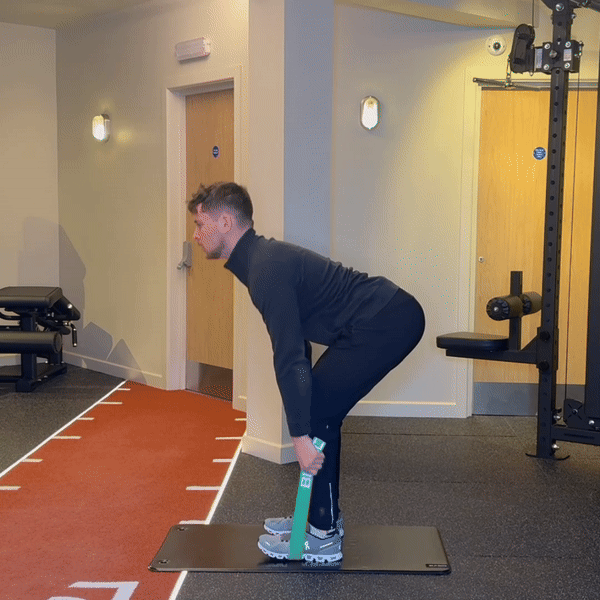 - Chọn một chiếc dây kháng lực nặng, gập đôi dây lại và đặt dây xuống sàn, đứng đè lên dây, hai chân rộng bằng hông.