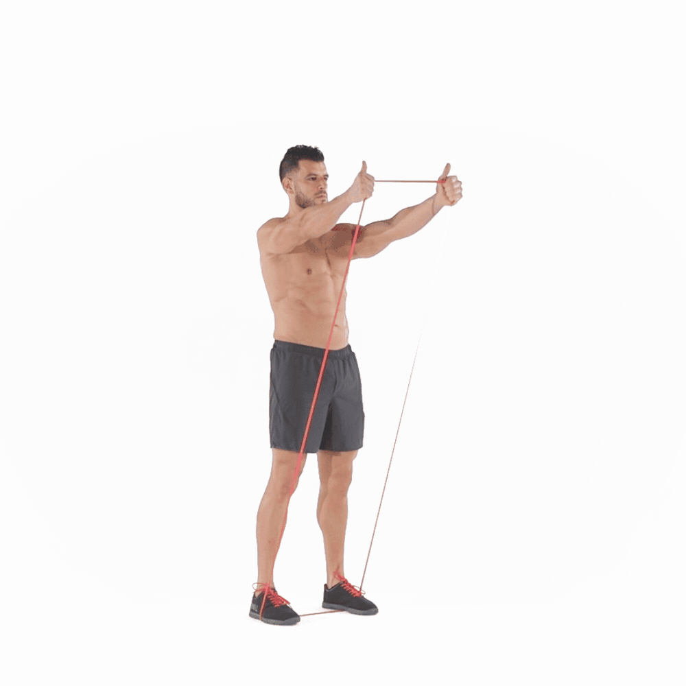 Để vai không đổ về phía trước khi ngồi lâu, bạn không nên bỏ qua động tác nâng tay trước với dây kháng lực.