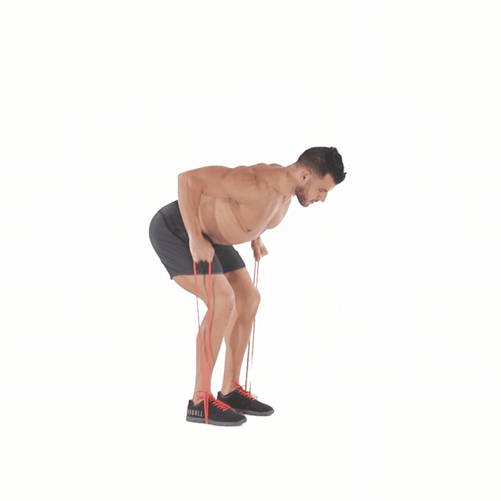 - Nắm hai đầu dây, siết cơ bụng. Kéo bả vai ra sau, cố gắng khép nách lại để giữ lưng ổn định.