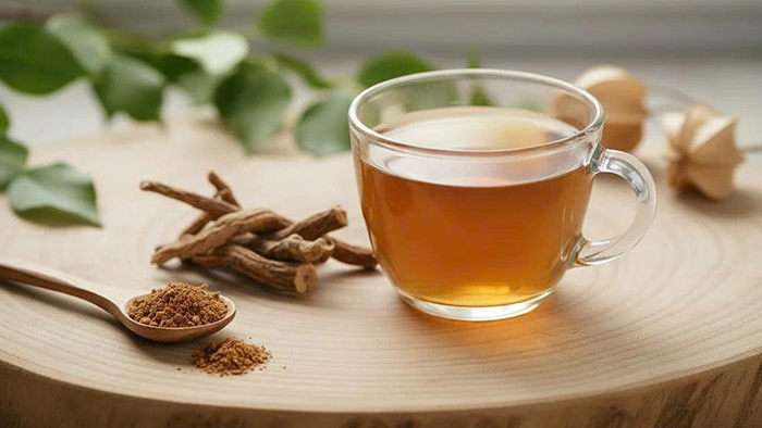 Trà rễ cam thảo được pha từ rễ cây cam thảo (glycyrrhiza glabra) - dược liệu quen thuộc trong y học cổ truyền.