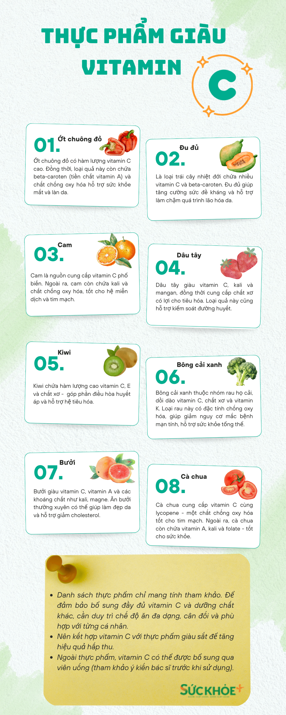 Cơ thể con người không thể tự tổng hợp được loại vitamin này, mà phải bổ sung qua thực phẩm hàng ngày hoặc viên uống bổ sung. Dưới đây là 9 loại thực phẩm phổ biến giàu vitamin C: