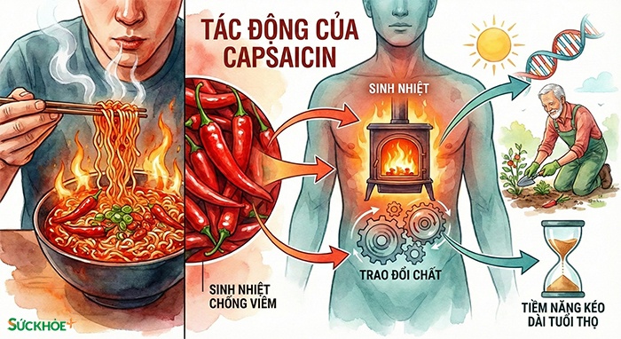 Theo chuyên gia dinh dưỡng Patricia Bannan tại Mỹ, capsaicin đóng vai trò như một chất kháng viêm tự nhiên, giúp cải thiện tuần hoàn máu, điều hòa cảm giác thèm ăn và hỗ trợ sức khỏe tim mạch. Một phân tích tổng hợp trên 461 bệnh nhân mắc hội chứng chuyển hóa cho thấy, capsaicin giúp giảm đáng kể lượng cholesterol toàn phần và cholesterol LDL "xấu". Đặc biệt ở phụ nữ, hợp chất này còn hỗ trợ giảm chỉ số triglyceride (chất béo trung tính).