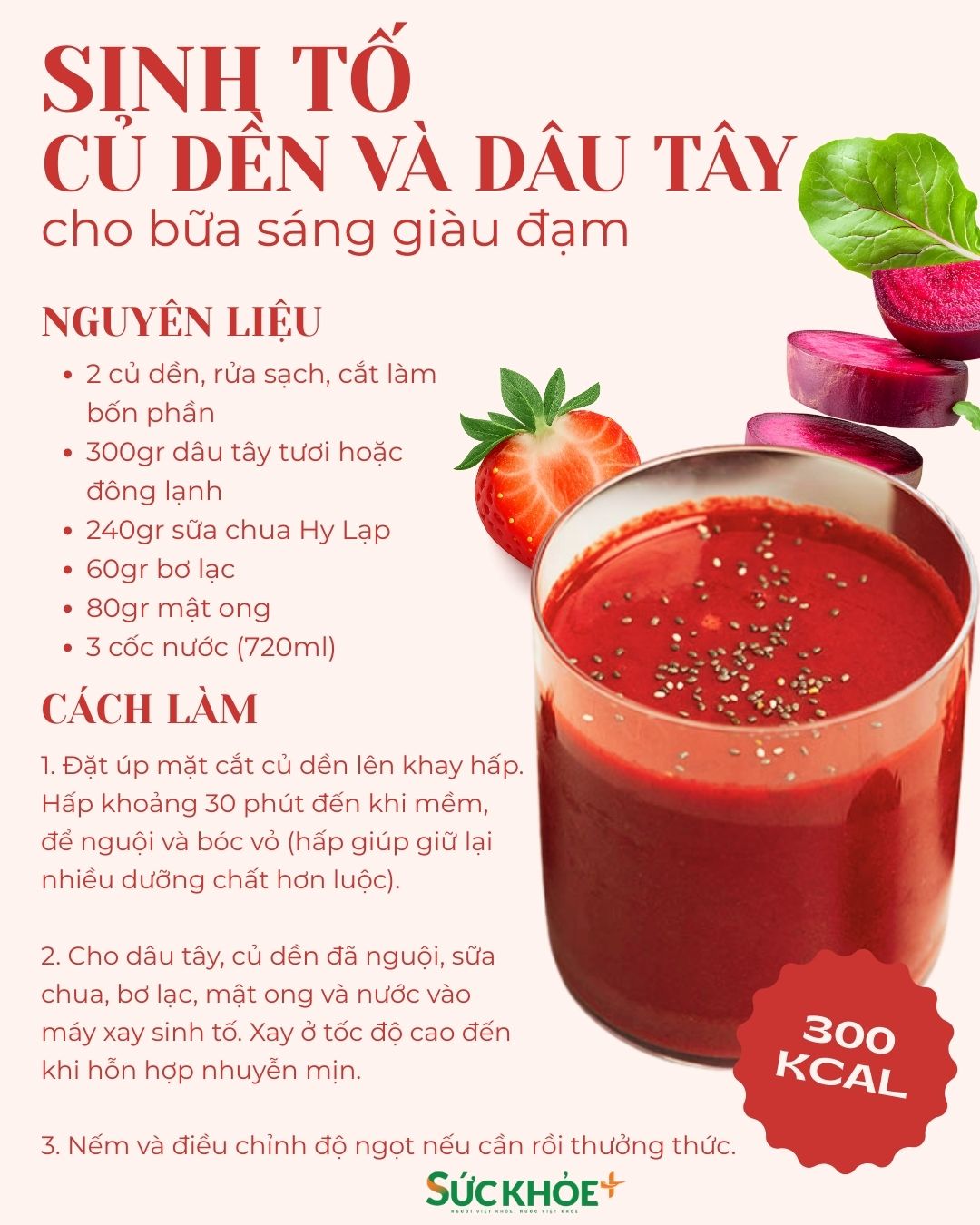 Sinh tố củ dền là lựa chọn phù hợp cho buổi sáng vì kết hợp carbohydrate dễ tiêu giúp cung cấp năng lượng cho vận động, vừa chứa protein hỗ trợ phục hồi cơ bắp.