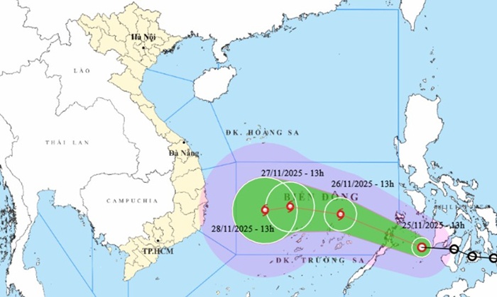 Trên biển Đông, tính đến 13h chiều 25/11, tâm áp thấp nhiệt đới đang ở trên khu vực miền trung Philippines, sức gió mạnh nhất vùng gần tâm áp thấp nhiệt đới mạnh cấp 7 (50-61km/h), giật cấp 9. Dự báo trong khoảng đêm nay đến rạng sáng mai, áp thấp nhiệt đới sẽ đi vào Biển Đông.