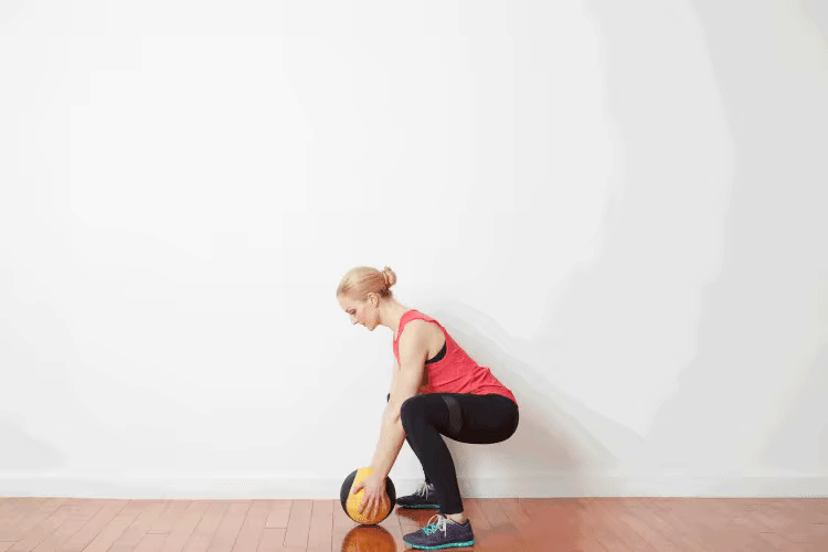 Hạ người vào tư thế squat, đồng thời đưa bóng xuống giữa hai chân, không đập bóng xuống sàn.