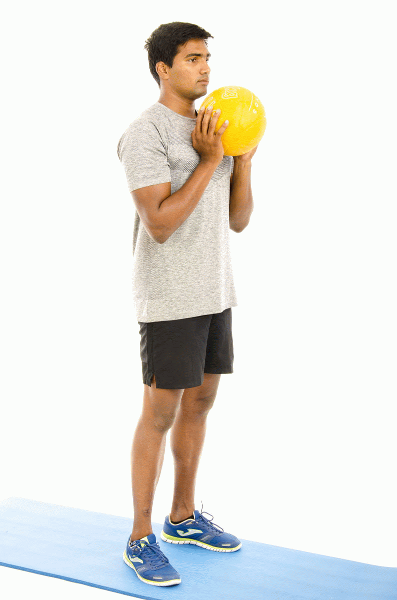 Động tác 1: Squat ôm bóng