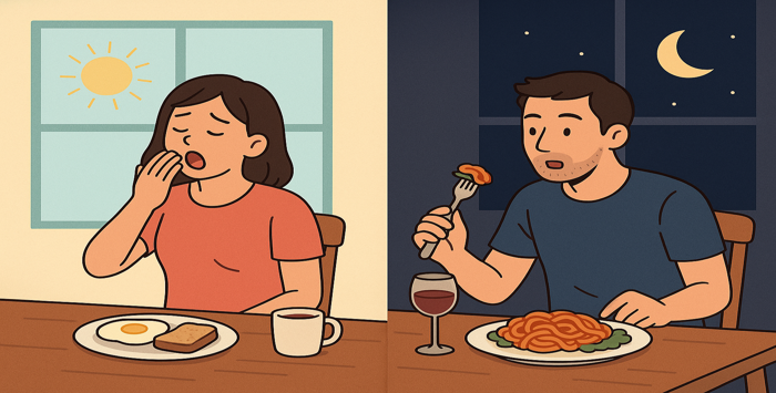 TS. Bernard Srour, chuyên gia tại Đại học Sorbonne Paris Nord (Pháp), cho biết: cơ thể nhạy cảm với insulin vào buổi sáng; nhưng vào buổi tối, khả năng dung nạp glucose giảm, tình trạng kháng insulin tăng. Vì vậy, cơ thể tiêu hóa và chuyển hóa tốt nhất vào ban ngày, đặc biệt từ sáng đến chiều.