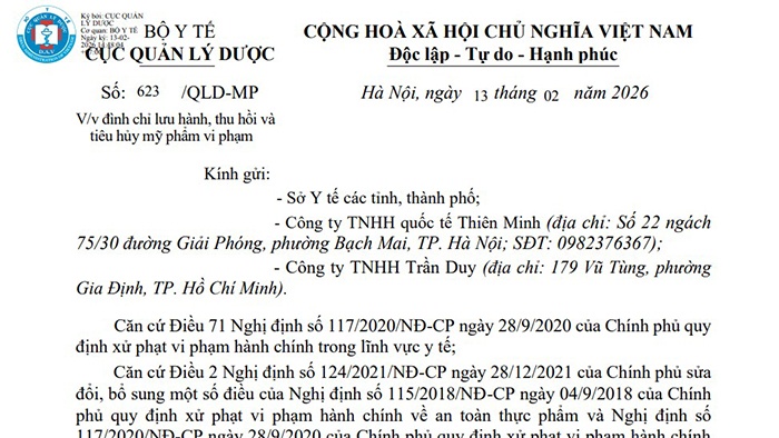Quyết định số 623/QLD-MP về việc đình chỉ lưu hành, thu hồi và tiêu hủy mỹ phẩm vi phạm với Công ty TNHH quốc tế Thiên Minh, Công ty TNHH Trần Duy - Ảnh chụp màn hình