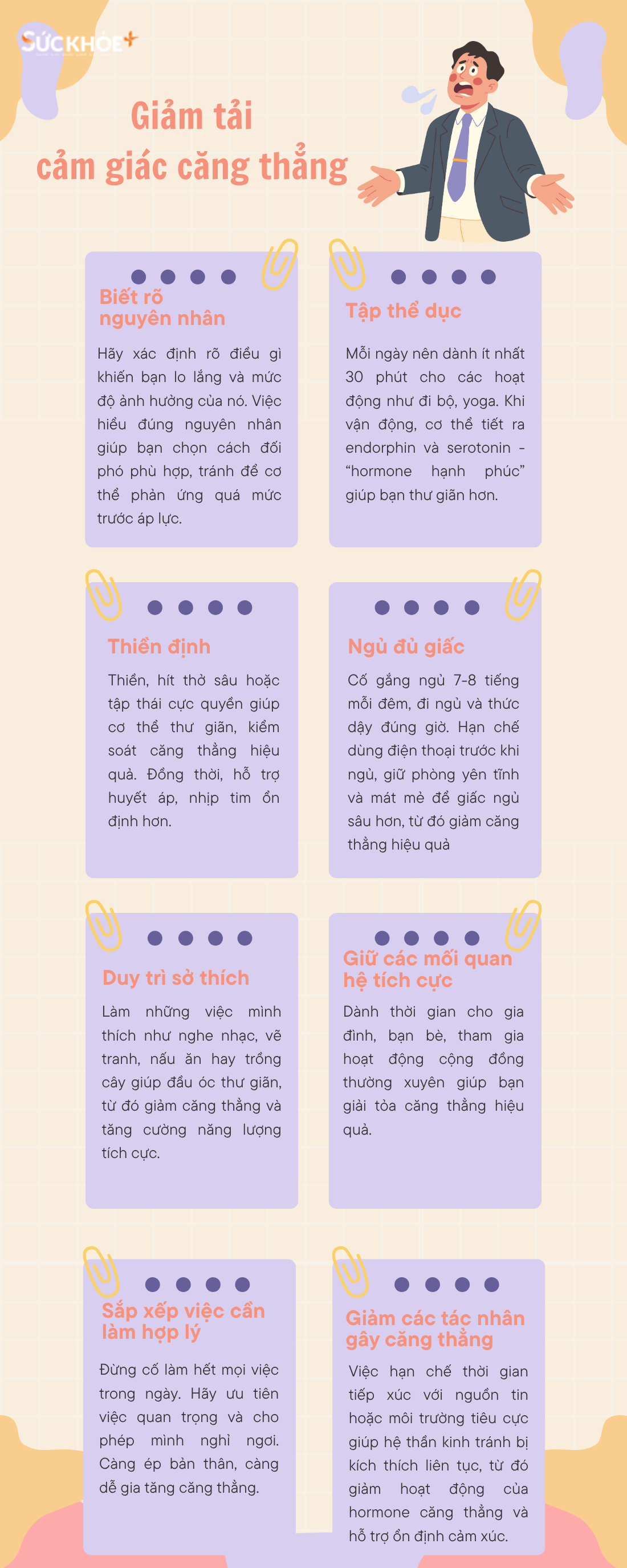 Khi bạn căng thẳng, cơ thể sẽ sản sinh ra nhiều hormone cortisol - được ví như “hệ thống cảnh báo tự nhiên” giúp cơ thể đối phó với các tình huống áp lực. Ở mức độ vừa phải, loại hormone này giúp duy trì năng lượng và sự tỉnh táo. Tuy nhiên, nếu cortisol tăng cao trong thời gian dài, nó có thể gây phản tác dụng, dẫn đến mệt mỏi, lo âu, mất ngủ. Việc cơ thể tích tụ quá nhiều cortisol trong thời gian dài còn có thể làm suy yếu hệ miễn dịch, gây rối loạn tiêu hóa và làm tăng nguy cơ mắc các bệnh mạn tính như tim mạch, đái tháo đường.