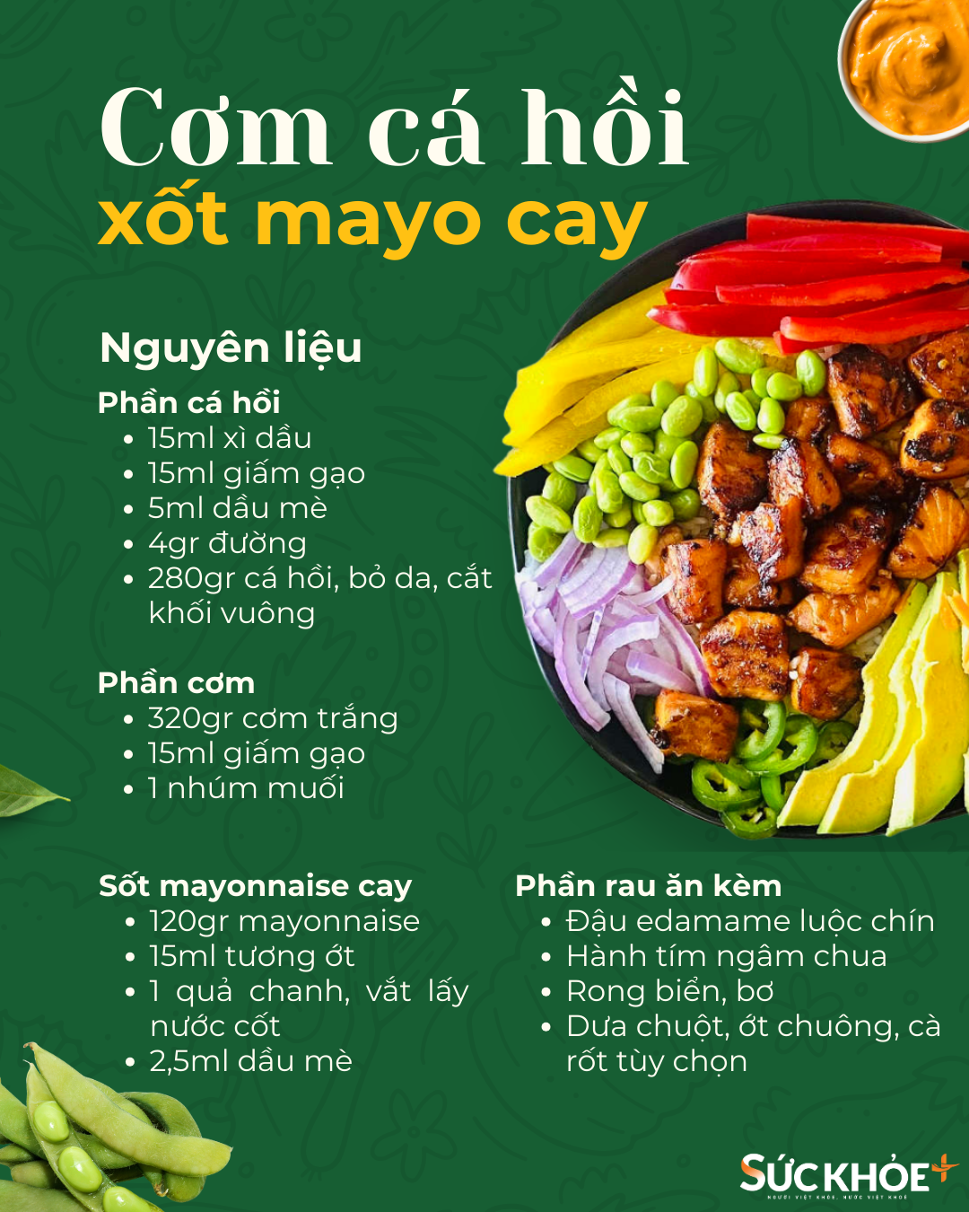 Đơn cử, công thức cơm cá hồi ăn kèm rau củ giúp bạn có bữa trưa đủ chất, cung cấp khoảng 600kcal và khoảng 35gr protein chất lượng cao. Cá hồi còn chứa acid béo omega-3 giúp giảm viêm và hỗ trợ phục hồi cơ bắp sau vận động. Chất xơ từ cơm và rau củ tạo cảm giác no lâu, giúp bạn duy trì năng lượng ổn định cho cả ngày.