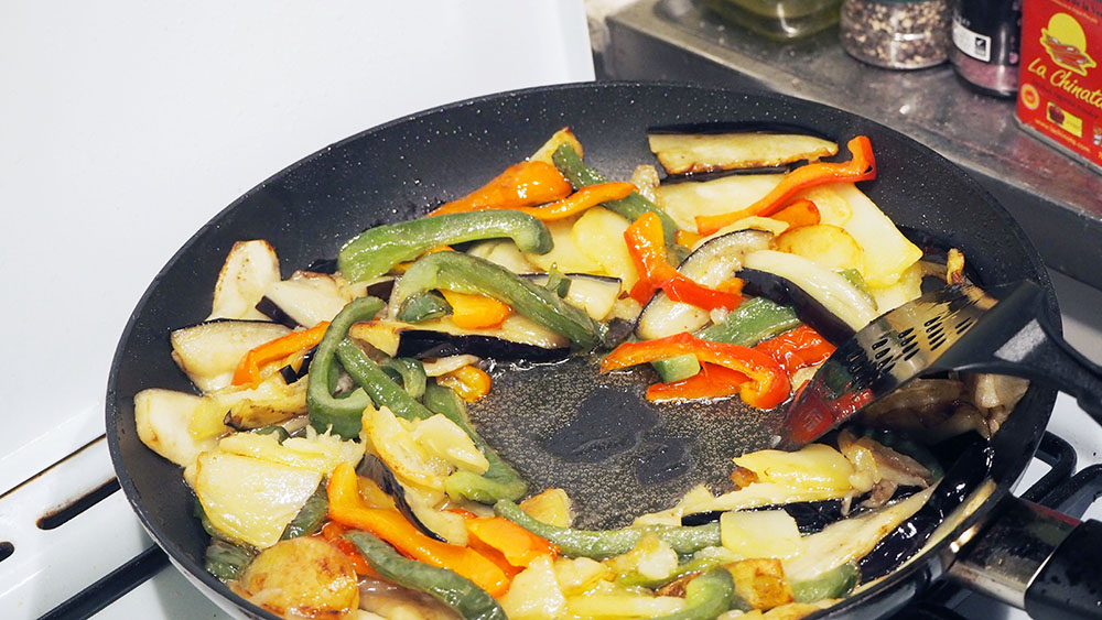 Bước 3: Chuẩn bị một chiếc chảo, thêm 1 thìa canh dầu ăn, cho cà tím vào đảo nhanh với một chút muối. Sau đó thêm ớt chuông và xào thêm 1-2 phút. Bước này giúp rau củ giữ được màu đẹp hơn.