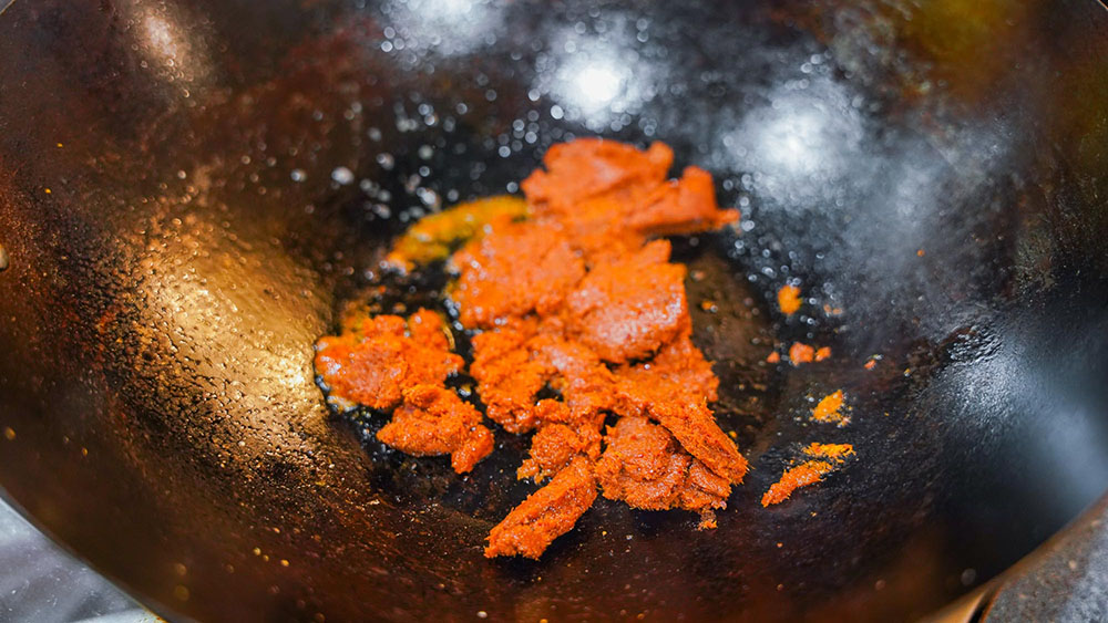 Bước 1: Cho dầu ăn vào nồi đun nóng. Thêm xốt cà ri đỏ vào và đảo khoảng 1 phút đến khi ngửi thấy mùi thơm. Thêm riềng, tỏi và sả băm vào, đảo thêm khoảng 1-2 phút, lưu ý không để cháy.