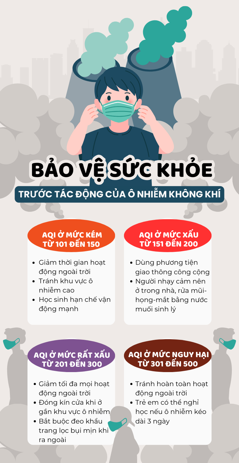 Từ nay đến cuối tuần, người dân nên tuân thủ khuyến cáo của Bộ Y tế để bảo vệ sức khỏe. Những người nhạy cảm với các chất ô nhiễm không khí cần tránh tiếp xúc với các nguồn phát thải ô nhiễm như khu vực giao thông, công trình xây dựng, các nơi đốt nhiên liệu bằng than, củi. Các khuyến cáo cụ thể được áp dụng tùy thuộc vào mức độ chất lượng không khí được thể hiện qua chỉ số AQI.