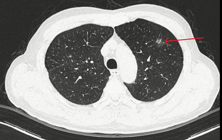 Trong quá trình chụp CT kiểm tra, bác sĩ tình cờ phát hiện một tổn thương dạng kính mờ thùy trên phổi trái, nghi ngờ ác tính nên chuyển bệnh nhân sang Trung tâm Y học hạt nhân và Ung bướu để đánh giá tiếp.