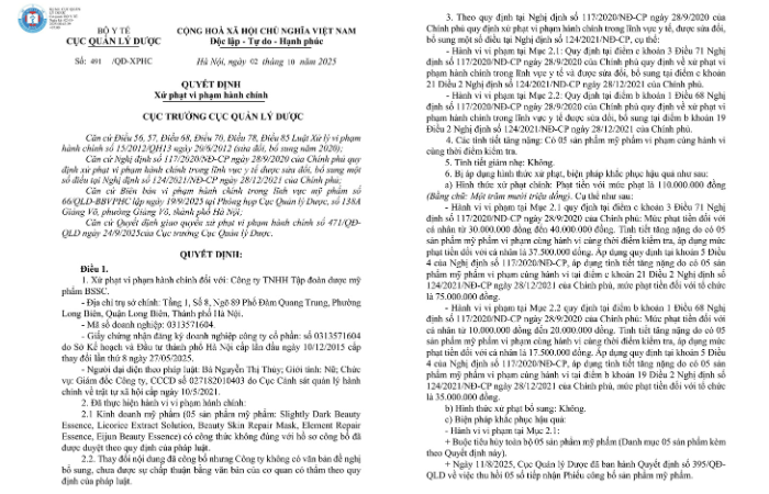 Quyết định của Cục Quản lý Dược về việc xử phạt vi phạm hành chính đối với Công ty TNHH Tập đoàn dược mỹ phẩm BSSC - Ảnh chụp màn hình.