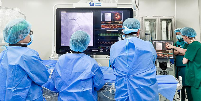 Bác sĩ đặt stent mạch vành cho bệnh nhân dưới sự hỗ trợ của kỹ thuật OCT - Ảnh: Bệnh viện Đa khoa Tâm Anh