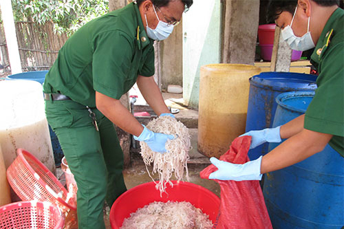 Đoàn kiểm tra đã phát hiện 261kg da, mỡ lợn đã sơ chế và 20kg da lợn thành phẩm. Chủ cơ sở sản xuất khai nhận, các sản phẩm sau khi được sơ chế tại đây sẽ được cung cấp cho các cơ sở trên địa bàn làm bóng bì, lạp xưởng và bán cho các hàng cơm tấm, bán bánh mì bì, bánh mì ruốc (chà bông). Bên cạnh đó, chủ cơ sở là đã không xuất trình được giấy phép kinh doanh và các giấy tờ kiểm dịch chứng minh nguồn gốc hàng hóa.