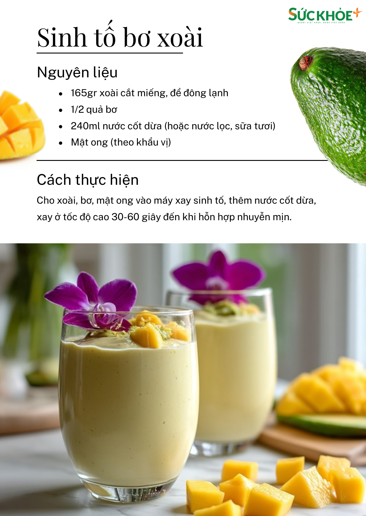 Sự kết hợp giữa xoài và bơ mang lại một nguồn dưỡng chất bổ trợ sức khỏe tim mạch. Trong đó xoài giàu chất xơ và vitamin C, hỗ trợ điều chỉnh đường huyết và cân nặng. Quả bơ lại giàu chất béo không bão hòa, cùng kali giúp ổn định huyết áp.