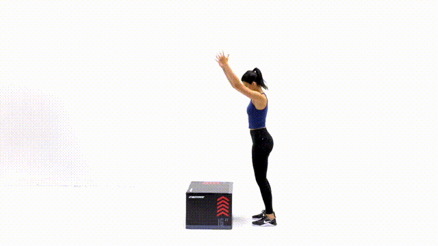 Hạ người vào tư thế squat nông, sau đó duỗi mạnh gối để bật lên hộp. Nếu chưa quen có thể điều chỉnh thành bước lên hộp.