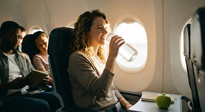 - Uống từng ngụm nhỏ liên tục: Hãy nhấp môi thường xuyên trong suốt chuyến bay. Việc phải đứng dậy đi vệ sinh thực tế lại có lợi, vì vận động giúp lưu thông máu và giảm tình trạng tê cứng cơ thể.