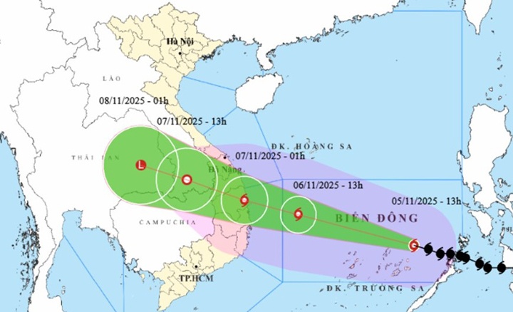 Liên quan đến cơn bão Kalmaegi (cơn bão số 13 trong năm 2025), hồi 13 giờ ngày 5/11, vị trí tâm bão ở vào khoảng 11,8 độ Vĩ Bắc; 117,6 độ Kinh Đông, cách đảo Song Tử Tây khoảng 360km về phía Đông. Sức gió mạnh nhất vùng gần tâm bão mạnh cấp 13-14 (134-166 km/giờ), giật cấp 17. Di chuyển theo hướng Tây Tây Bắc, tốc độ 20-25km/h.